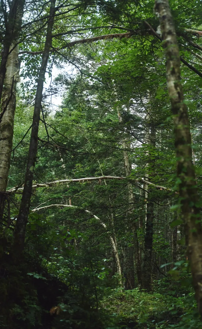 春に訪れれば、ミズバショウが群生する場所も数多いという。ふかふかのトレイルをのんびりと時間をかけて歩いて行くと、子供時代に遊んだ里山を思い出す。変化に富んだトレイル上にはいくつかの美しい池もあり、そのひとつひとつでゆったりと休憩しながら歩みを進める。