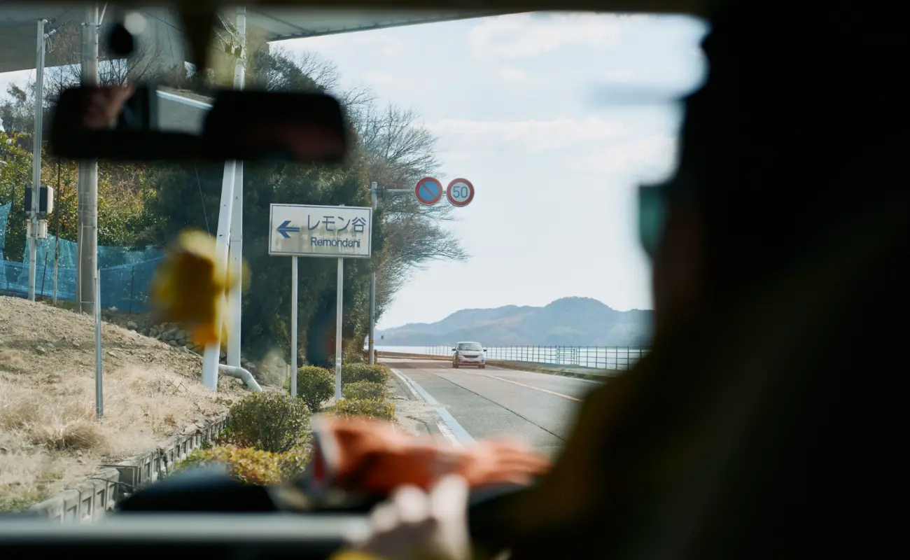後ろにひっくり返ってしまいそうな急斜面を軽バンで登っていく。運転席に座るのは「れもんだに のうえん」の永井英夫さん。レモン印のキャップが素敵だ。