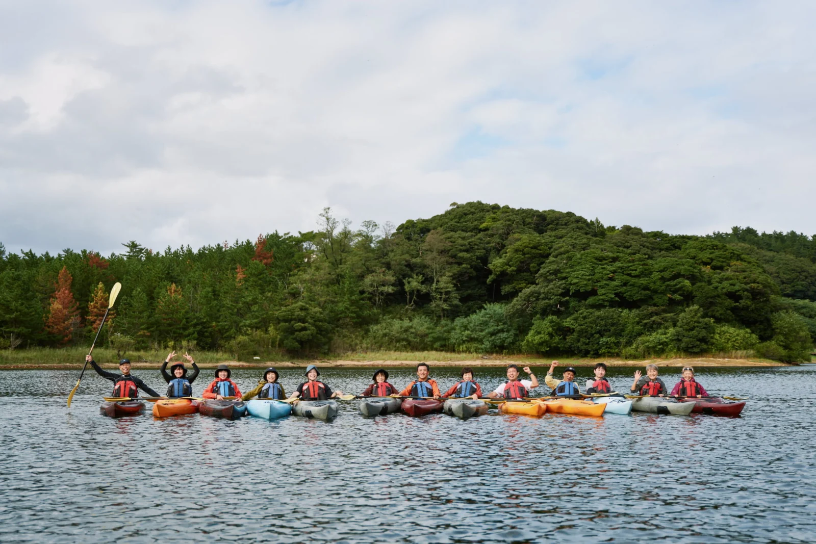 風の影響で波が非常に高いため、カヤック場所を多鯰ケ池へと変更。砂丘にほど近い多鯰ケ池は鳥取砂丘によってせき止められた堰止湖である。移動後、鳥取県自然体験塾の皆さんにカヤックの漕ぎ方などをレクチャーいただいた後、早速全員で漕ぎ始める。目標は周囲約4kmある池を一周。田中陽希さんはとても追いつけないスピードで縦横無尽にカヤックを走らせたり、カヤックの漕ぎ方を教えていただいたりと、「アスリートは違いますね。」とゲストも思わず声を漏らしていた。天候も回復しゆっくりとした雰囲気のなかで、初めての方もカヤックを楽しむことができた。