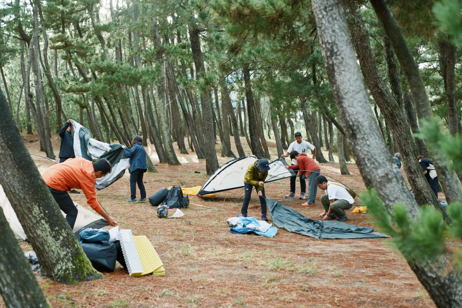 1日目は浜坂県民サンビーチ・松の庭キャンプ場でテント泊。目の前に海が広がる松林のなか、思い思いの場所にTHE NORTH FACEのテントを組み立てる。準備後、夕食は近くにあるお食事処・渡辺水産で田中陽希さんとの会話も楽しみながら山陰の海の幸を堪能した。