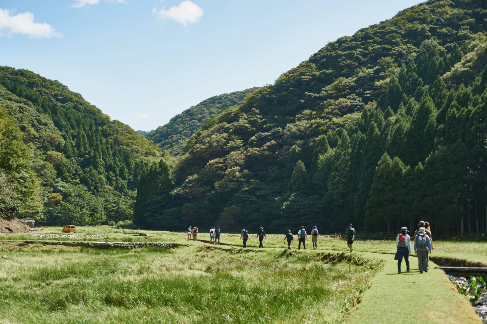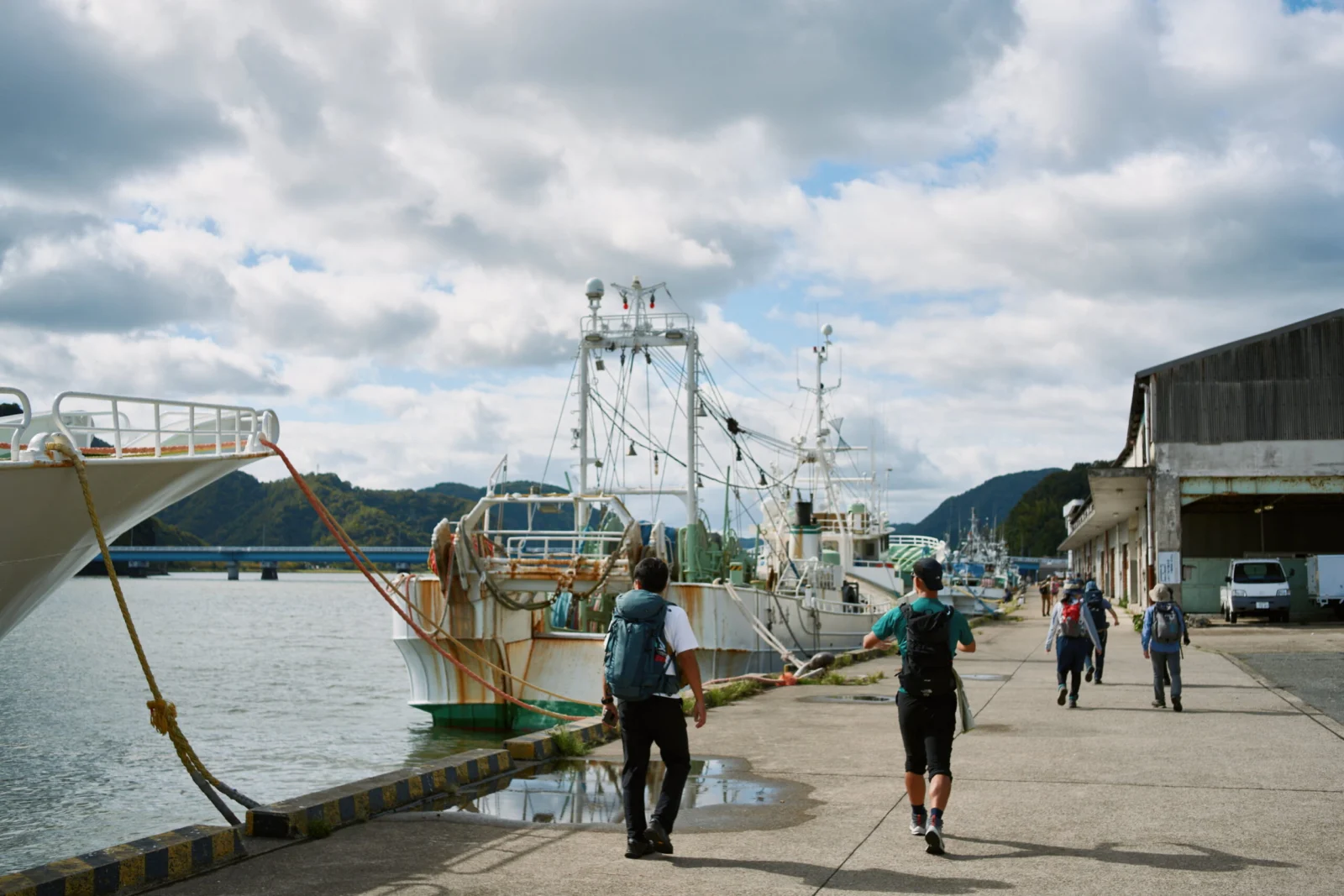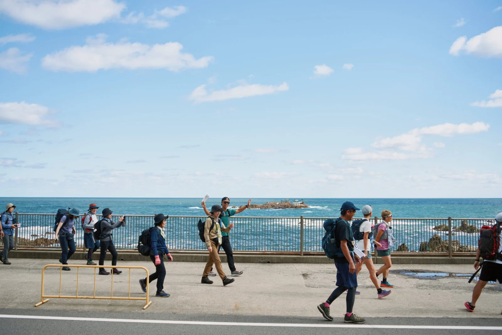 午前は兵庫県と京都府の県境を通り、山道を越えるコース21からスタート。海を横目に出発し、日本海とともにある暮らしも感じながら田結湿地へと歩みを進めた。田結湿地は一度絶滅したコウノトリが野生復帰した場所でもあり「見れると良いですね。」と話をしていると、なんと1羽のコウノトリに出会うことができた。サギよりも体が大きく、優雅に舞う姿に全員が釘付けとなった。