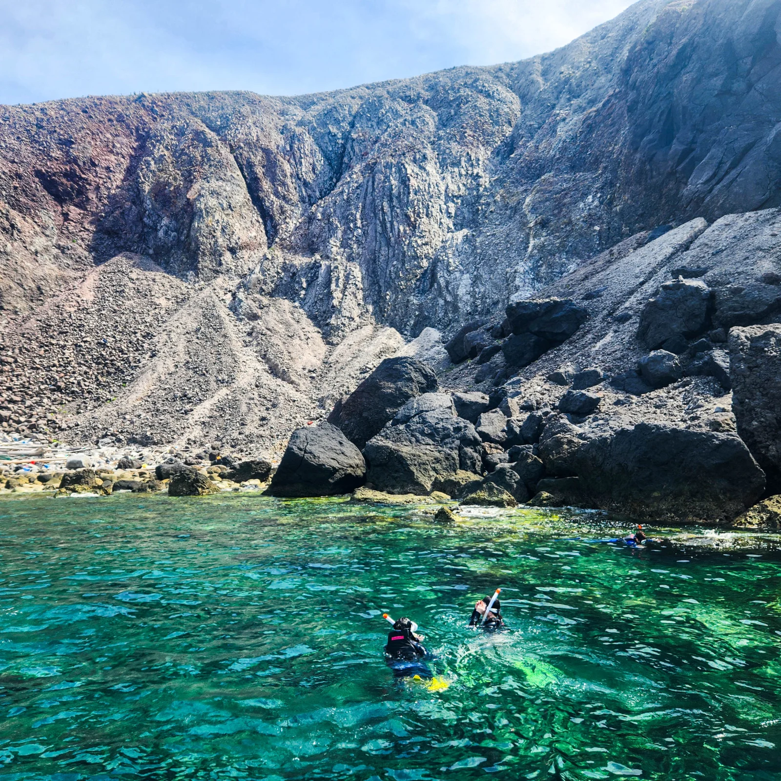 朝、レンタサイクルで式根島港へ移動し、式根島港よりシュノーケリングツアーに参加。抜群の透明度を誇る海へと向かいます。迫力ある断崖絶壁の海岸地形を船上から眺めながらポイントまで船で移動します。その後、レンタサイクルで島内にある温泉施設・憩の家へ移動します。落ち着いた雰囲気の中でゆったりと湯につかり、旅の疲れを癒します。お昼は、商店「おくやま」自慢の漬け丼弁当。見晴らしの良い場所で食べる漬け丼は最高です。